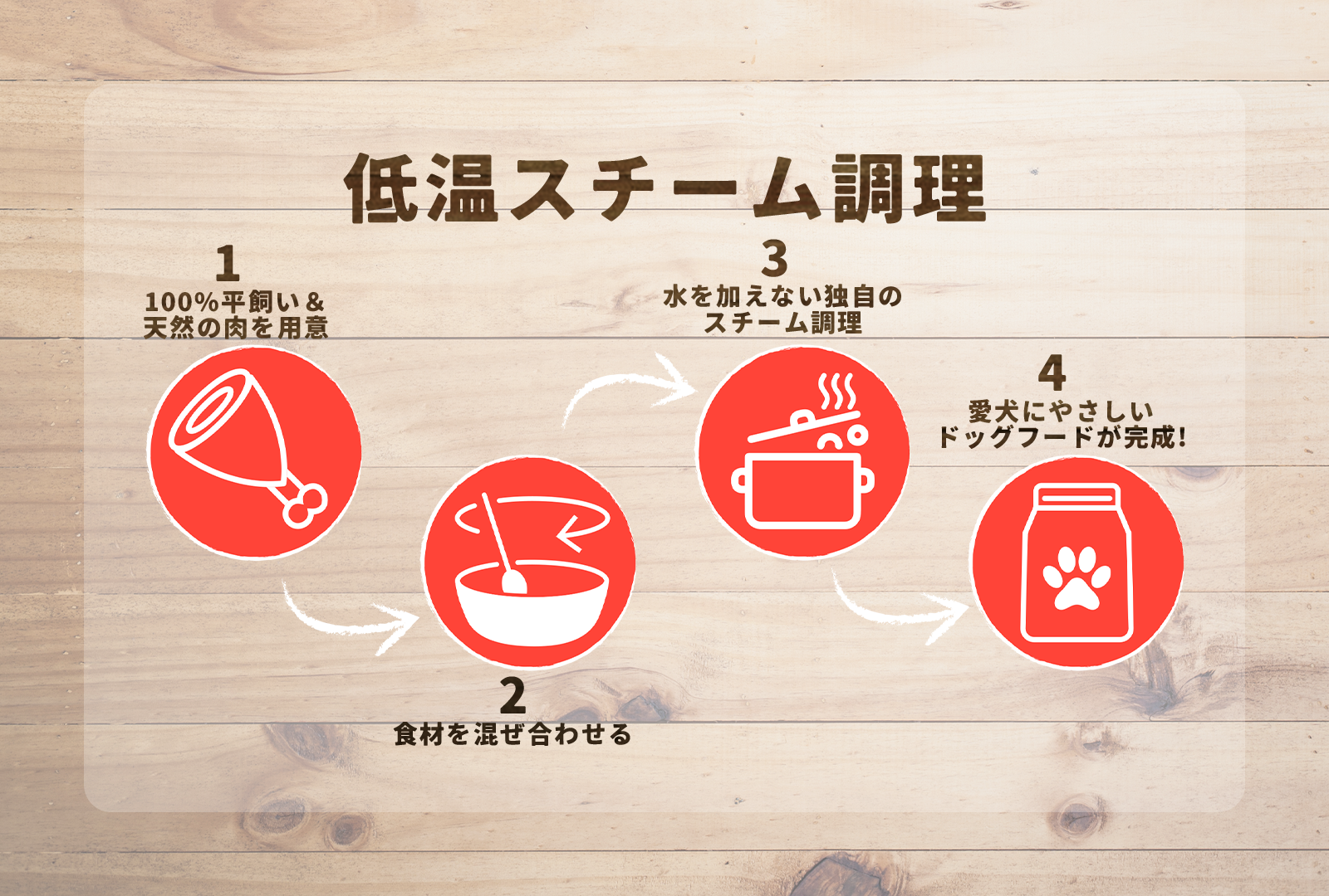 采用低温蒸煮工艺制作,保持营养与新鲜度,对爱犬友好的狗粮。不使用水,防止异物混入。