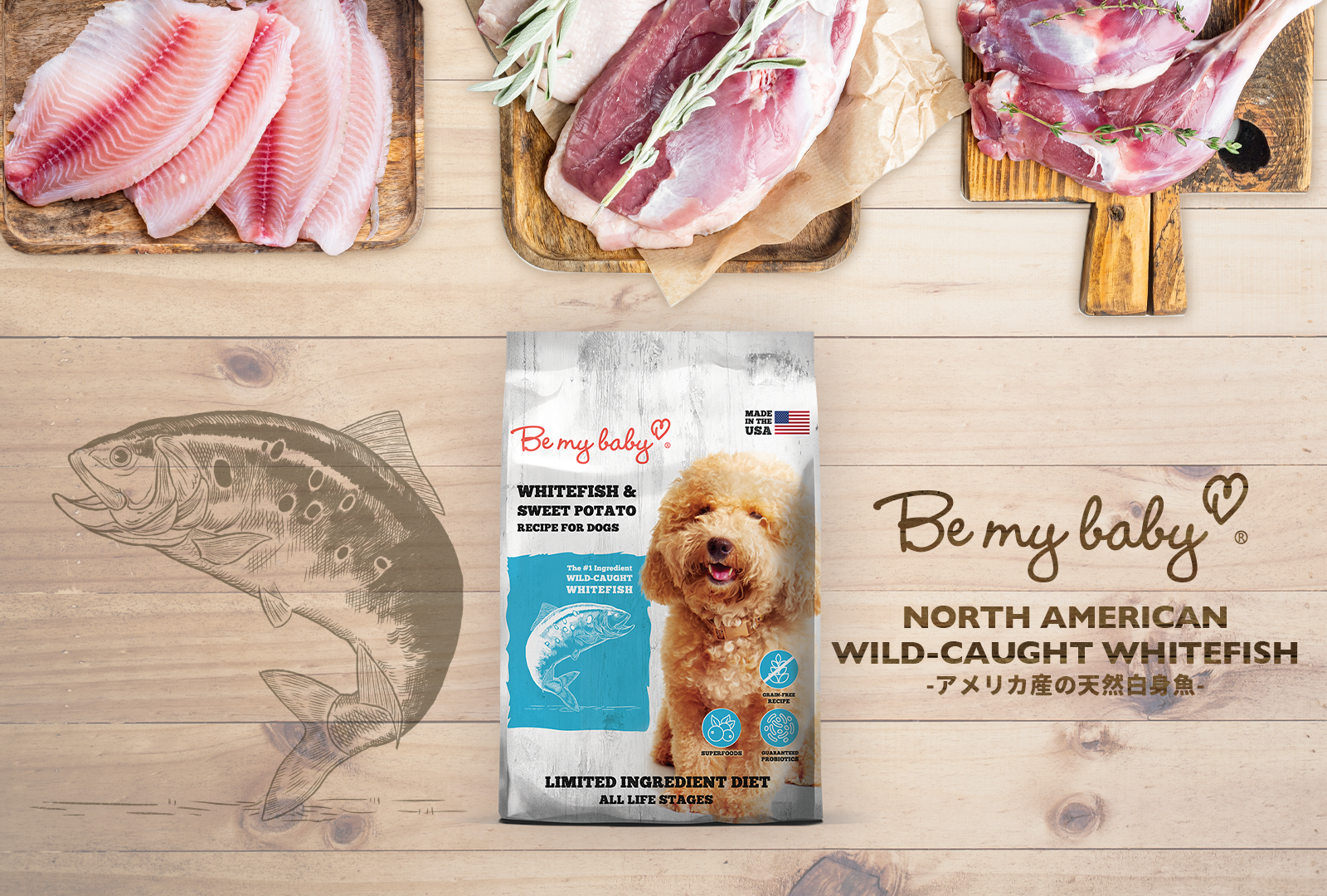 白身魚、魚粉、甘薯、豌豆、鷹嘴豆、馬鈴薯、芥花籽油(用混合生育酚保存)、番茄渣、馬鈴薯蛋白、亞麻籽、天然香料、食鹽、氯化膽鹼、乾菊苣根、絲蘭萃取物、番茄、藍莓、覆盆子、乾植物乳酸桿菌發酵物、乾枯草桿菌發酵物、乾嗜酸乳桿菌發酵物、乾糞腸球菌發酵物、乾動物雙歧桿菌發酵物、維他命E補充劑、蛋白鐵、蛋白鋅、蛋白銅、硫酸亞鐵、硫酸鋅、硫酸銅、碘化鉀、硝酸硫胺(維他命B1)、蛋白錳、氧化錳、抗壞血酸、維他命A補充劑、生物素、菸鹼酸、泛酸鈣、硫酸錳、亞硒酸鈉、維他命B6、維他命B12補充劑、核黃素(維他命B2)、維他命D補充劑及葉酸。